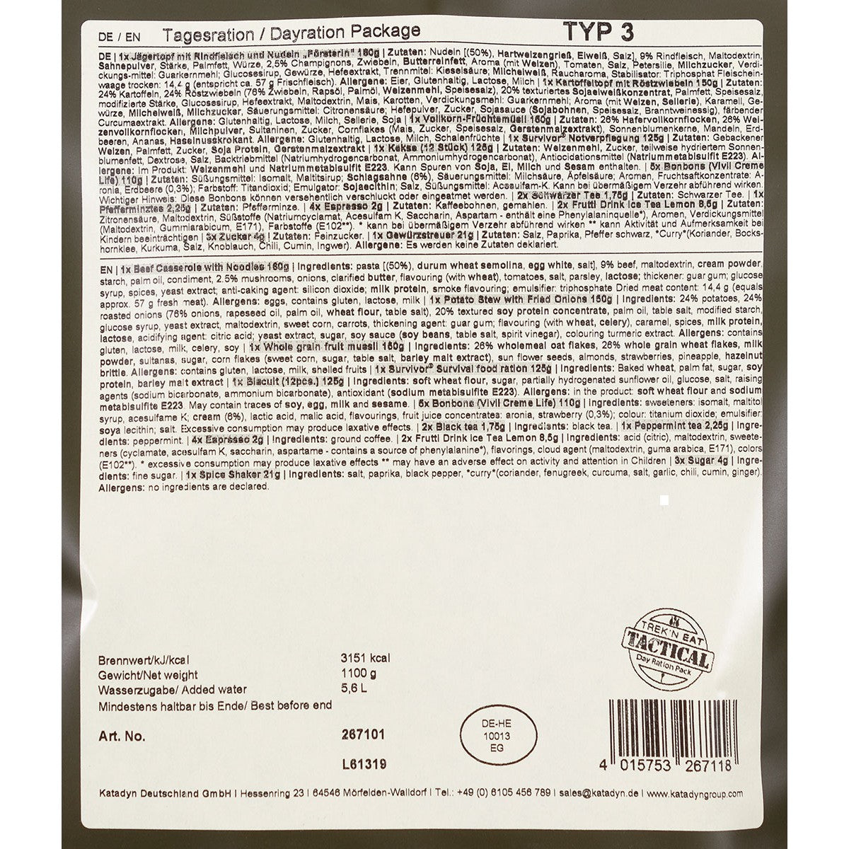 Tagesration für eine Person mit vollständiger Verpflegung und Getränkeauswahl. Das Paket kombiniert zwei warme Hauptmahlzeiten (Jägertopf und Kartoffeltopf), Müsli, Notverpflegung und Kekse mit einer vielfältigen Getränkepalette – schwarzer Tee, Pfefferminztee, Espresso und Eistee-Varianten. Bonbons und Zucker runden das Angebot ab. Zur Zubereitung werden 13,6 Liter Trinkwasser benötigt. Mit 3.011 kcal deckt die 959-g-Ration den täglichen Energiebedarf zuverlässig ab. Der wasserdichte, wiederverschließbare Transportbeutel mit integriertem Gewürzstreuer ermöglicht flexible Lagerung und Handhabung.