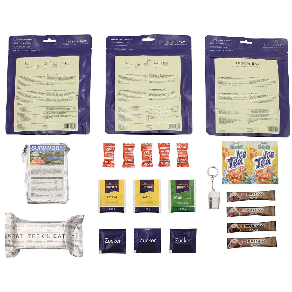 Vegetarische Tagesration für eine Person mit aromatischen Hauptmahlzeiten. Das Paket kombiniert Gemüse Jambalaya und vegetarische Bolognese mit Nudeln als Hauptgänge, ergänzt durch Vollkornmüsli und Notfallverpflegung. Energiegehalt: 3028 kcal bei 1034 g Gesamtgewicht. Umfassendes Getränkesortiment mit schwarzem Tee, Pfefferminztee, Espresso und Fruchtsaftgetränken. Im wasserdichten, wiederverschließbaren Transportbeutel verpackt. Ideal für Expeditionen und Notfallvorsorge.
