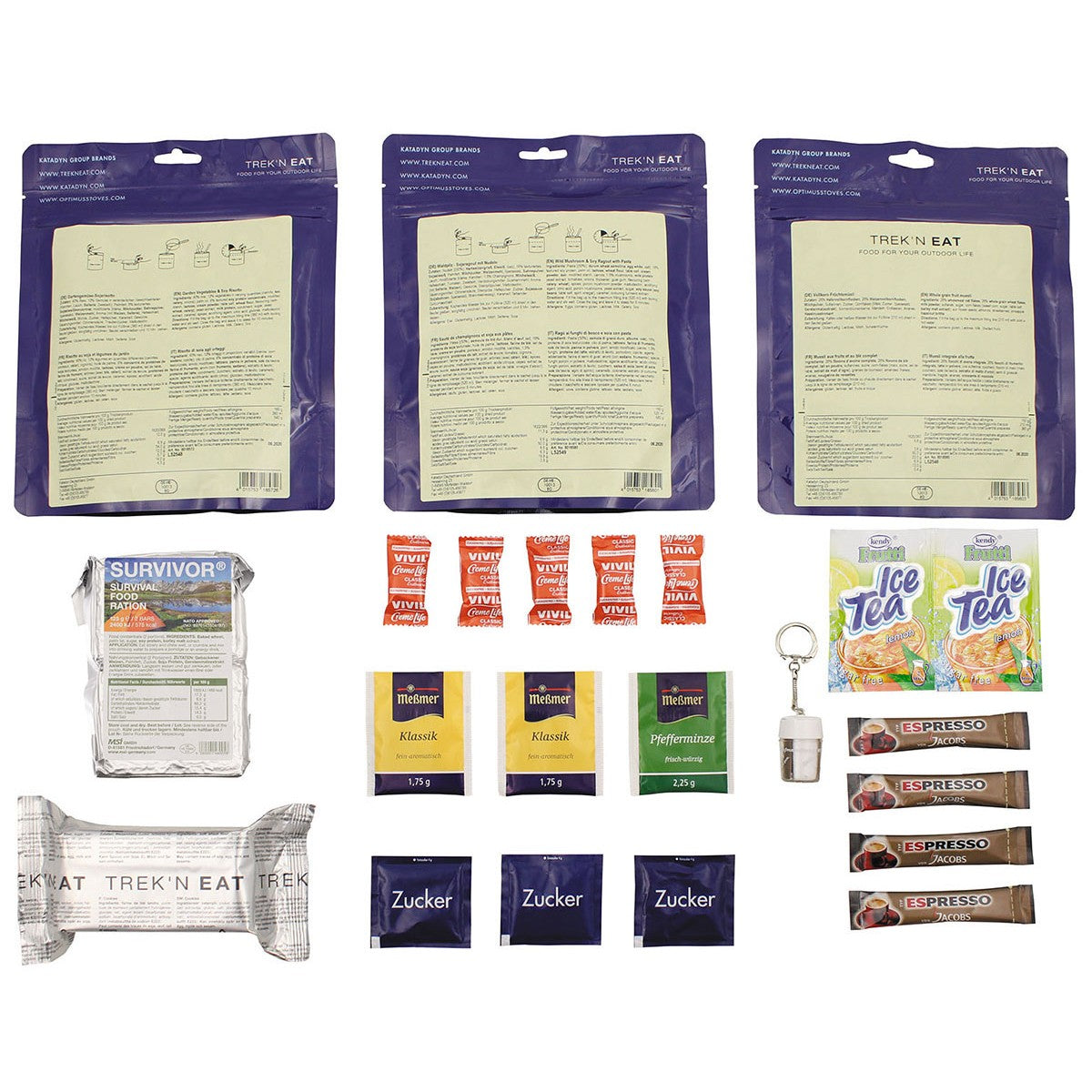 Vegetarische Tagesration für eine Person mit vollwertigen Hauptmahlzeiten auf Gemüsebasis. Das Set bietet Gartengemüserisotto und Waldpilzragout mit Nudeln als Hauptgänge, ergänzt durch Frühstücksmüsli und Notfallverpflegung. Energiegehalt: 2988 kcal bei 959 g Gesamtgewicht. Umfangreiche Getränkeauswahl mit Tee- und Kaffeevarianten sowie Fruchtsaftgetränke. Alles in wasserdichtem, wiederverschließbarem Transportbeutel – perfekt für Trekkingtouren, Notfallvorsorge und Outdoor-Abenteuer.